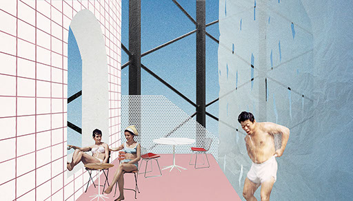 The flooding provided a sustainable treatment of the structure and at the same time automatically builds up a catalogue of material serving for an eventual exhibition space. The strategy of the main intervention for the masterplan followed the logic of this sequence, proposing an open bath inside the first gasometer where the water–analogous to the gas–was the purest and could be used ideally for the purpose of a new therme. The interpretation was based on the idea of understanding the public behaviour of the ancient Roman bath by analysing and directly translating the order of spaces for individual bodily needs. For the final design of the building, the (idealised) plans of historic examples were turned into the section of the new programme, changing the logic from a horizontal succession of patterns towards a vertical circulation surrounded by the rough texture of the industrial heritage.