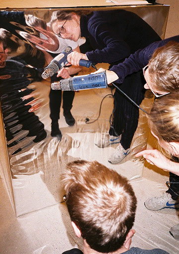 The models presented themselves on top of a partly mirrored, partly marble-clad stair envisioned to achieve visibility and to accommodate the required technical equipment. A central installation turning the purely materialised transition space into a temporary show room functioned as a spatial division between the models and the audience by simply elevating the stage onto a single element. In its very presence, the object meant to dissolve the perception of matter in its built context, displaying the interplay between marble and mirrored glass in its most available version by covering a wooden framework with textured paper (Wolkenmarmor) and heating up mirror foil stretched around to generate an evenly reflective surface. This conceptual and equally economic design decision was constructed in analogy to the sphere lamp behind the room made from transparent textile in favour of a diffuse and yet singular source of light.