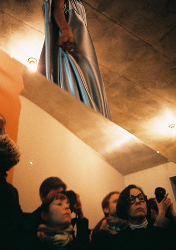 The layering of the opposite glass facades mounting the action allowed for a public (front) and private (back) view of the event, solely detached by a provisional bar between the street and the courtyard. The front row was situated around the interior piece, abandoning any clear form of hierarchy among the visitors but the proximity to the presented product. By doing this, the circulation within the space forced to accumulate around the purposely non-parallel catwalk and created dynamic, unpredictable and sometimes chaotic situations in contrast to the repetitively staged performance upstairs. The rather small scale of the object made the individually shown garments appear like independent exhibitions with the rough condition of the venue serving as an ideal scenery for the defined nature of the collection and its enacted presentation.