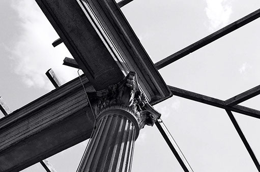 The exclusive location for the Spring-Summer 2015 show of Perret Schaad at the Kronprinzenpalais’ garden was surrounded by typical Berlin-Mitte construction sites. The interesting tension between the scenic condition of the backyard and the industrial presence of the cranes was supported and intensified by abstract, coloured surfaces reminiscent of analogue collages. The guests were seated on the lawn, along two central runways to allow both closeup and total views of the collection. The spacious greenery offered an ideal platform for an outdoor fashion show whose main curation was based on the logistical layout of different materials: pathways, lawns, stairs, beds, façades. It was therefore only necessary to setup the event according to the existing principle of the place by arranging the audience parallel to the walks along the grass, since the collection was presented in loops around the central garden.