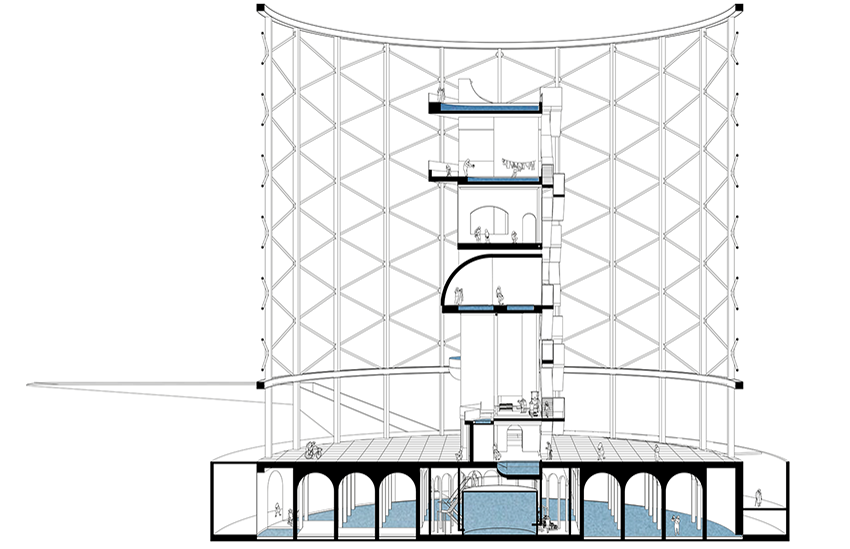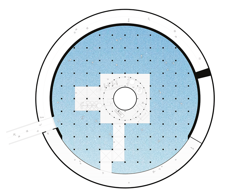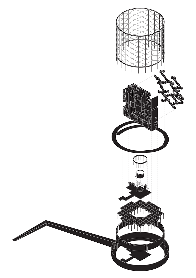 The flooding provided a sustainable treatment of the structure and at the same time automatically builds up a catalogue of material serving for an eventual exhibition space. The strategy of the main intervention for the masterplan followed the logic of this sequence, proposing an open bath inside the first gasometer where the water–analogous to the gas–was the purest and could be used ideally for the purpose of a new therme. The interpretation was based on the idea of understanding the public behaviour of the ancient Roman bath by analysing and directly translating the order of spaces for individual bodily needs. For the final design of the building, the (idealised) plans of historic examples were turned into the section of the new programme, changing the logic from a horizontal succession of patterns towards a vertical circulation surrounded by the rough texture of the industrial heritage.
