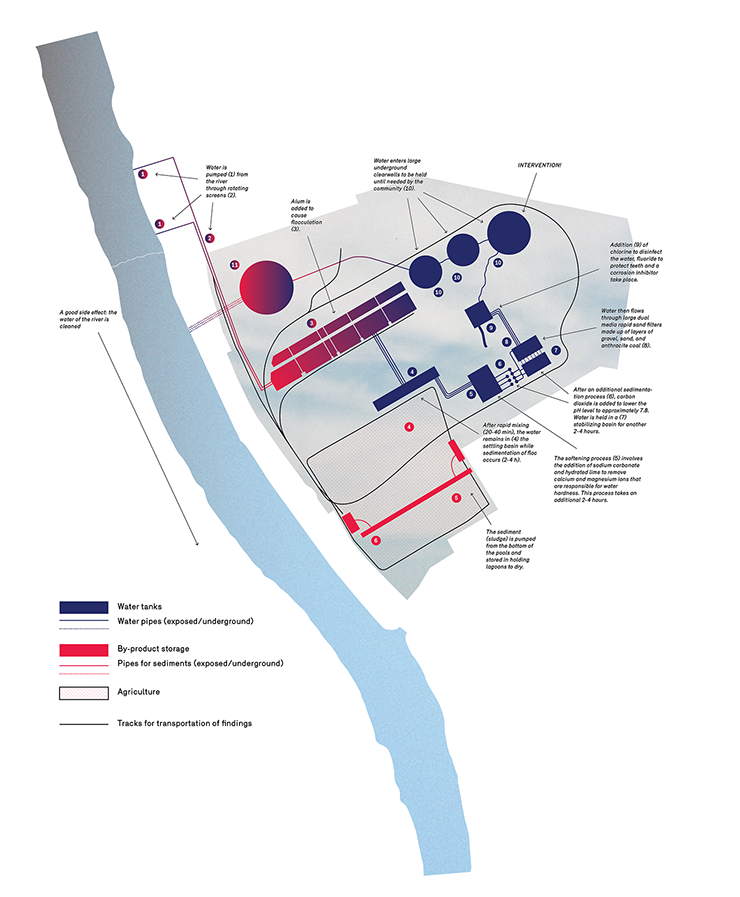 Next to being in charge of the natural flow of information, goods and cultures over time, the water has inevitably been collecting materials in its embankments, unintentionally exposed through its pure passive storage lacking too much of public attention. This role of both activating urban transformation processes and natural erosion qualifies the river as a source for findings, waste and hidden treasures. Through the exposition of findings from the water, the original gas purification facilities were reused for the sake of a cleaner river: the water itself, its sediments and potential objects were caught by the cranes on the north side of the plot and processed further to synchronise the production of coal and gas.