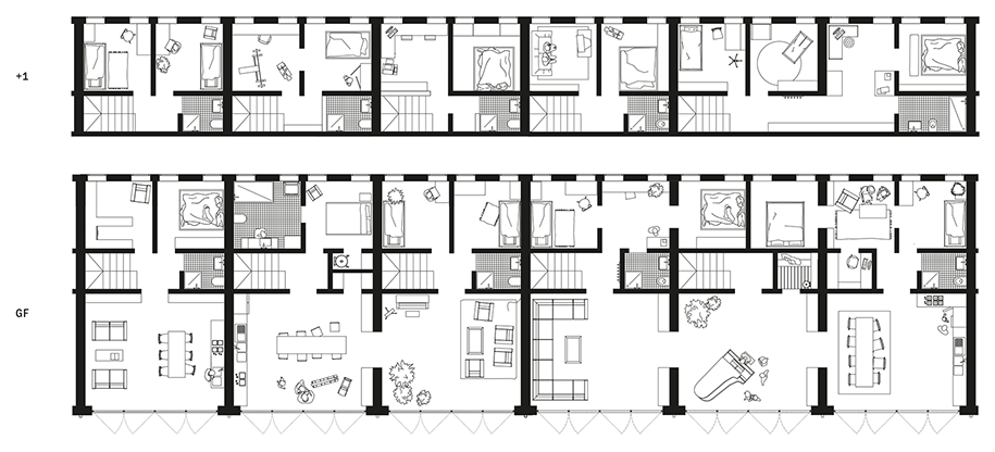 The characteristic layout of the framing building accommodated three types of floor plans, each being adaptable to the numbers and requirements of residents within a unit. This generated a flexible and equally sustainable composition for the entire system by enabling the structural grid to maintain while customising the homes with the prospective occupants.