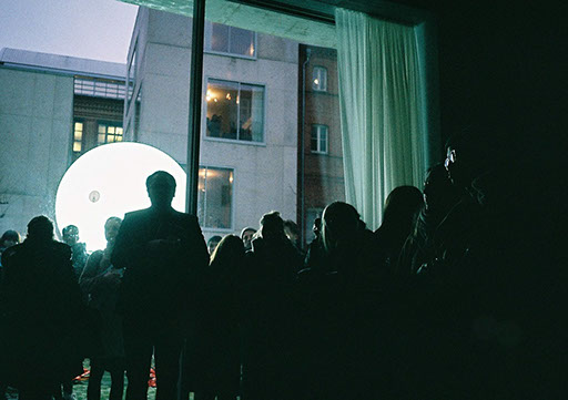 The models presented themselves on top of a partly mirrored, partly marble-clad stair envisioned to achieve visibility and to accommodate the required technical equipment. A central installation turning the purely materialised transition space into a temporary show room functioned as a spatial division between the models and the audience by simply elevating the stage onto a single element. In its very presence, the object meant to dissolve the perception of matter in its built context, displaying the interplay between marble and mirrored glass in its most available version by covering a wooden framework with textured paper (Wolkenmarmor) and heating up mirror foil stretched around to generate an evenly reflective surface. This conceptual and equally economic design decision was constructed in analogy to the sphere lamp behind the room made from transparent textile in favour of a diffuse and yet singular source of light.