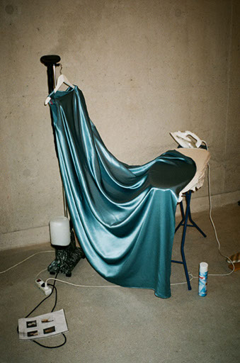 The layering of the opposite glass facades mounting the action allowed for a public (front) and private (back) view of the event, solely detached by a provisional bar between the street and the courtyard. The front row was situated around the interior piece, abandoning any clear form of hierarchy among the visitors but the proximity to the presented product. By doing this, the circulation within the space forced to accumulate around the purposely non-parallel catwalk and created dynamic, unpredictable and sometimes chaotic situations in contrast to the repetitively staged performance upstairs. The rather small scale of the object made the individually shown garments appear like independent exhibitions with the rough condition of the venue serving as an ideal scenery for the defined nature of the collection and its enacted presentation.