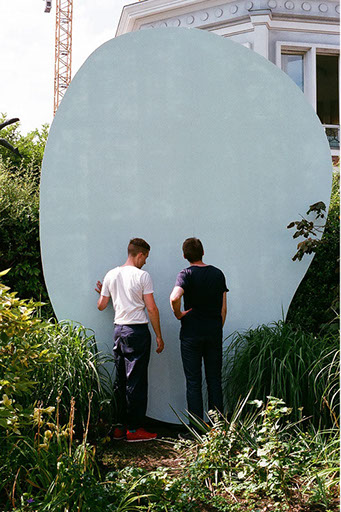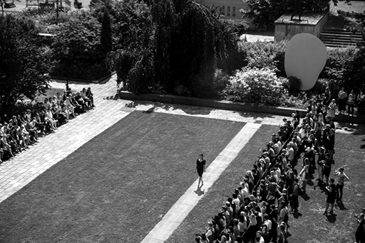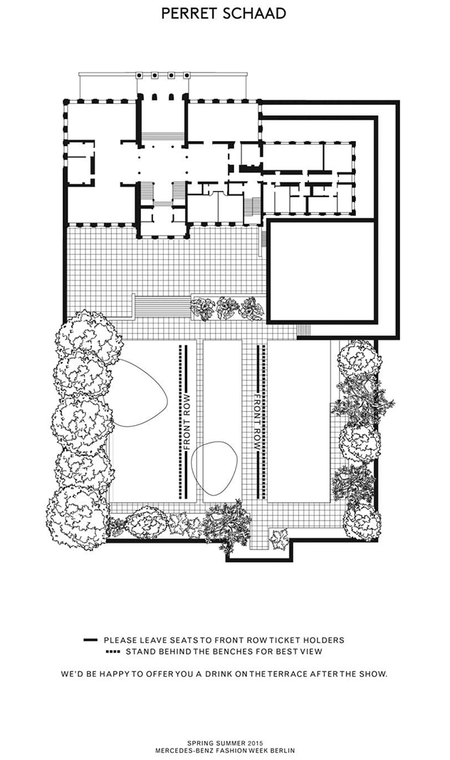 The exclusive location for the Spring-Summer 2015 show of Perret Schaad at the Kronprinzenpalais’ garden was surrounded by typical Berlin-Mitte construction sites. The interesting tension between the scenic condition of the backyard and the industrial presence of the cranes was supported and intensified by abstract, coloured surfaces reminiscent of analogue collages. The guests were seated on the lawn, along two central runways to allow both closeup and total views of the collection. The spacious greenery offered an ideal platform for an outdoor fashion show whose main curation was based on the logistical layout of different materials: pathways, lawns, stairs, beds, façades. It was therefore only necessary to setup the event according to the existing principle of the place by arranging the audience parallel to the walks along the grass, since the collection was presented in loops around the central garden.