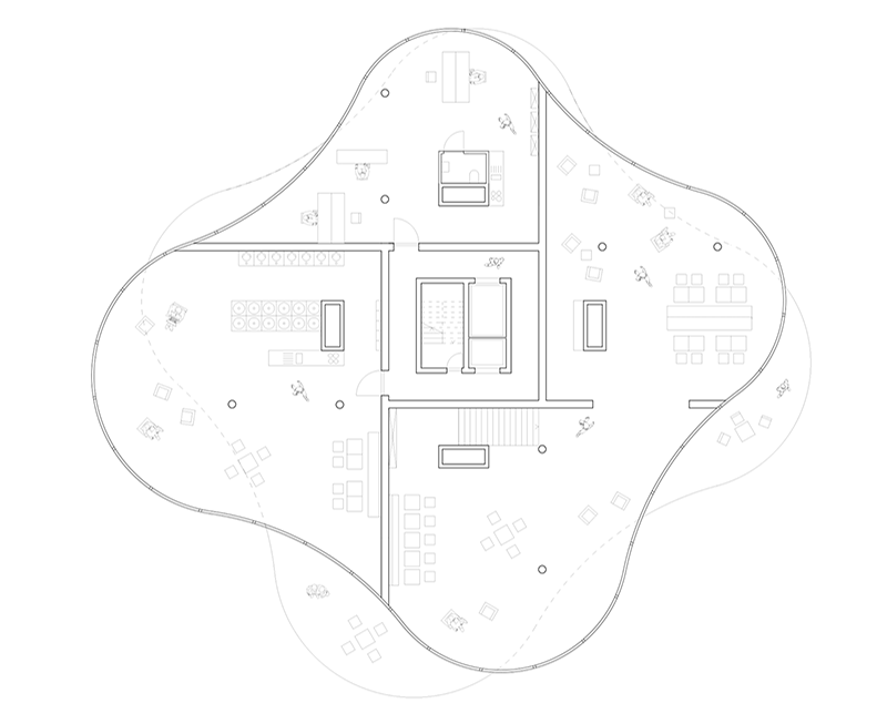 The production and the vertical addition of various floor plans led to the final design of the building whose conscious setting managed to the value of the green spot. Since none of the levels were equal to each other, there were inevitable overlaps that could ideally be used as an outdoor area for every room. Every living area was organised around another core providing the technical units. This layout created a free spatial setup generating a flexible division into compartments in which the curved line of the glass facade provided a widescreen panorama and visually enlarged the room by utilising its full ratio.