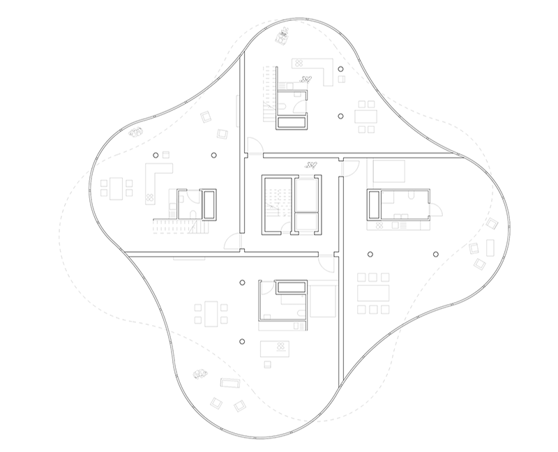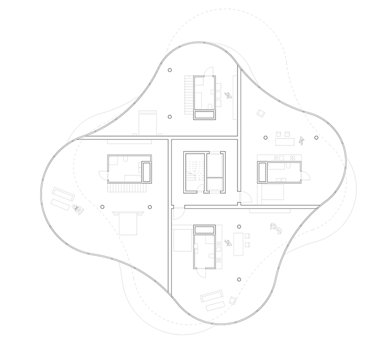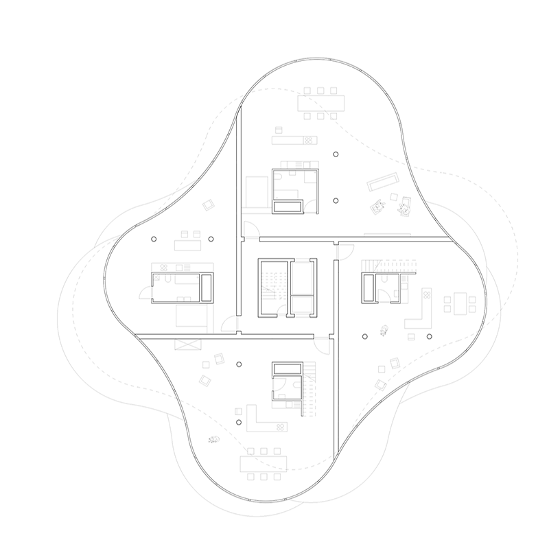 Logement sur l’Herbe aimed to offer a building on a piece of unaffected nature within a suburban context, set at the intersection of two lines–the railway tracks as a built head way on the one side and the Limmat as a grown stream on the other–the site consisted of a green park and a couple of trees that bordered it from the riverbank. Based on the idea of wanting to keep the existing land as natural as possible, the project created a minimal footprint on the ground and enabled the remaining space to be designed more freely. The interior organisation of the dwellings followed a strictly logical strategy acting on the assumption that all flats were supposed to be arranged around a central service core. The circulation was the epicenter of a braided cross which was in turn reflected before four circles of different sizes have been inscribed: S, M, L, XL. The tangential connection of shapes generated the prototypical form of one floor plan whose diverse phenotypes were developed through reflection and rotation. Each level consisted of four modules that didn't necessarily represent one flat but were supposed to be considered as single units that could be interconnected among each other to enable the formation of two- or three-storey apartments.